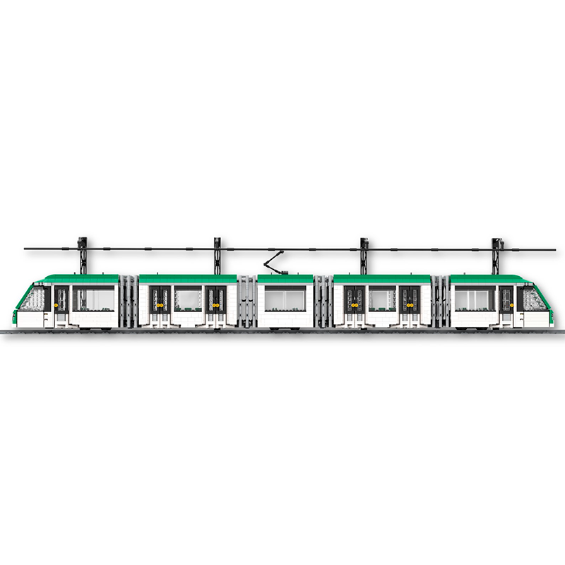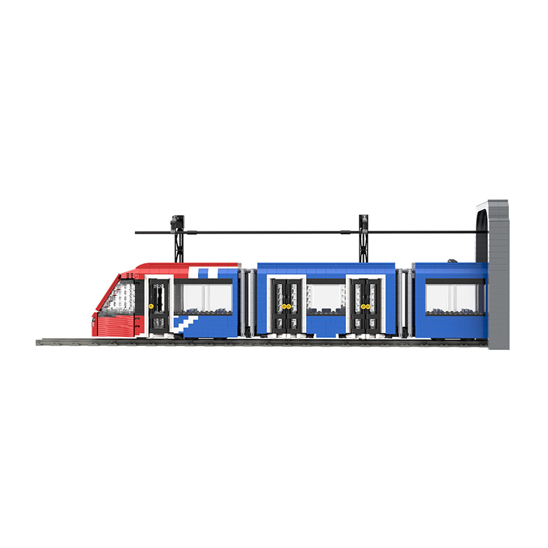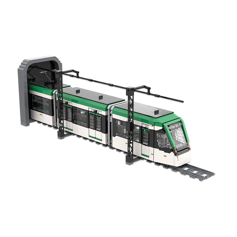Explora la ciudad a bordo del tranvía CAF Urbos 3 Málaga. Un MOC de 2584 piezas que dispone de techo desmontable y puertas que se pueden abrir manualmente